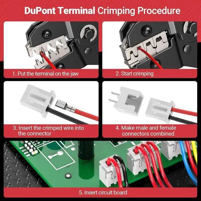 RATCHETING CRIMPER TOOL: Our wire crimping tool features a smooth ratcheting mechanism that ensures perfect crimps every time with minimal effort. The automatic handle release makes crimping JST, DuPont, AMP, Deutsch & Delphi connectors a breeze, saving you time and energy on your electrical projects