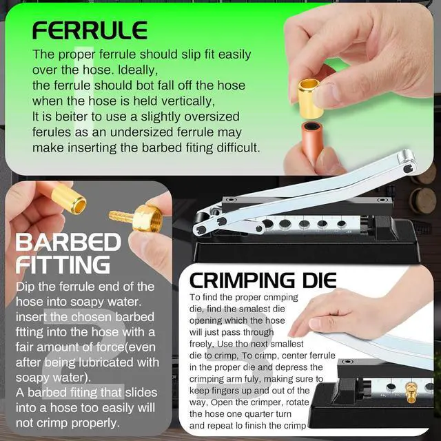 Portable design: The Heavy Duty Air Hose Repair Kit features a portable, compact design that makes it easy to repair air hoses in the field or in the shop, It can be fixed on the workbench and has a built-in adjustable screw for adjusting the crimping pressure, which is suitable for different sizes of hoses.