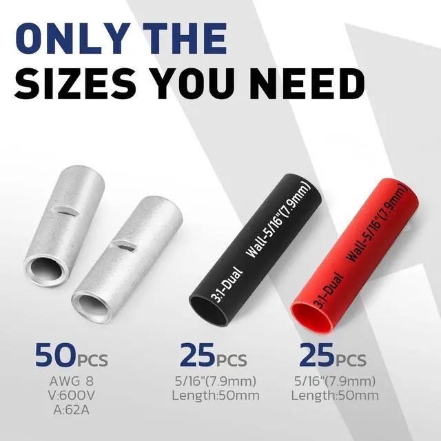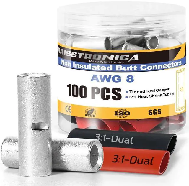 Complete Solution: 50pcs Non-Insulated butt connectors (AWG8) & 50pcs 3:1 heat shrink tubing (Red/Black, ) for automotive, marine, DIY and Industrial Applications