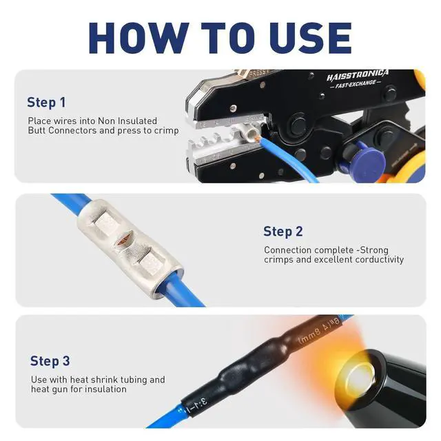 Strong Crimps: Heavy-duty seamless butt connector barrels ensures ultra-secure crimps, Wire stop at the terminal center visually confirms full wire seating and proper alignment, ensuring maximum crimping tightness