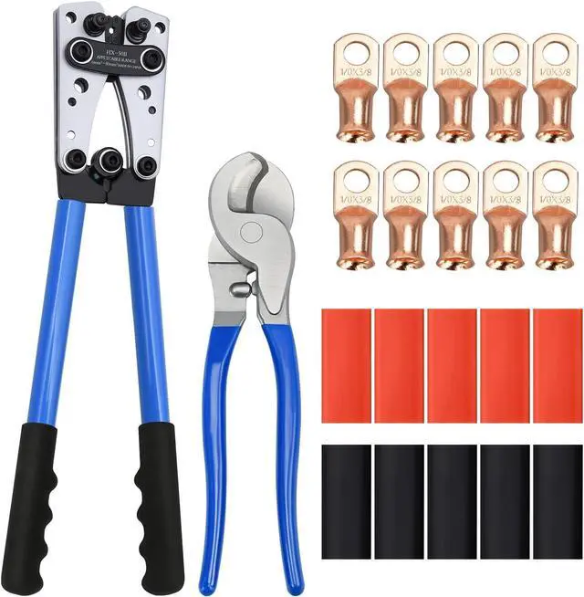 Package Include- Package includes 1pcs cable lug crimping tool, 1pcs cable cutter, 10pcs copper wire lugs and 10pcs heat shrinkable tube.