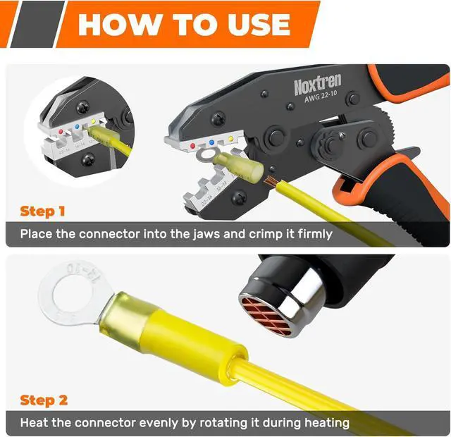 Professional Crimping Tool: The precision-engineered ratcheting crimping tool applies uniform pressure for consistent, damage-free crimps on various heat shrink connectors. Its color-coded dies (red/blue/yellow) simplify gauge identification, making it ideal for both beginners and professionals who need a dependable terminal crimper.