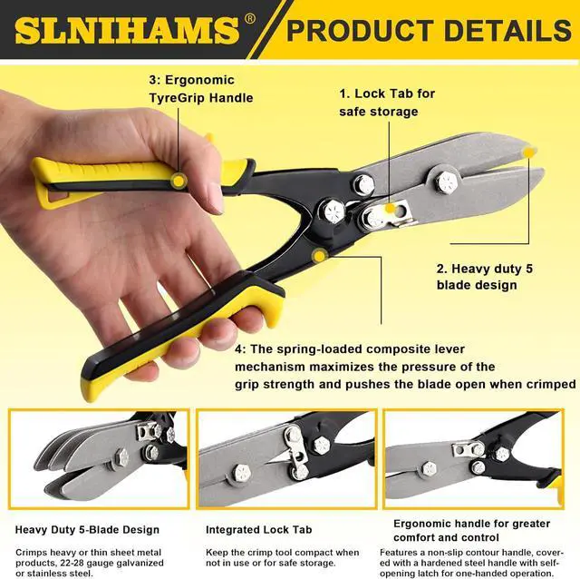 This gutter crimping tool have integrated safety lock keeps your sheet metal tools crimper compact for easy to store, and the 5 blade crimpers heads safe from damage.