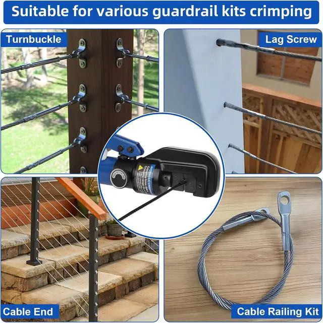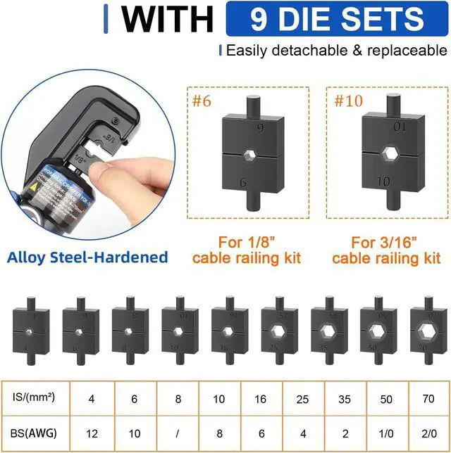 Versatile Crimping Tool This hydraulic swaging tool includes nine dies with a wide size range: 12 AWG - 2/0 AWG, perfect for crimping tasks such as cable railing kits and wire lugs. Die #6 (1/8" ) is ideal for 1/8" cable railing hardware, while Die #8 and #10 fit 3/16" cable railing tensioners.