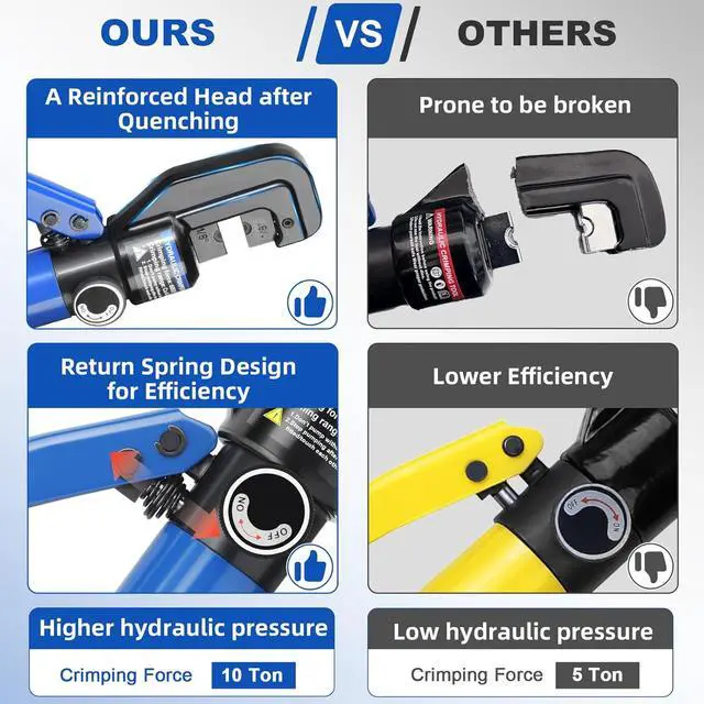 Professional Design Our hydraulic wire crimper features a spring at the lever, reducing effort and boosting efficiency compared to other brands. The crimp head rotates 360° freely, making it highly effective in narrow spaces. The handle is wrapped in rubber for a comfortable grip.