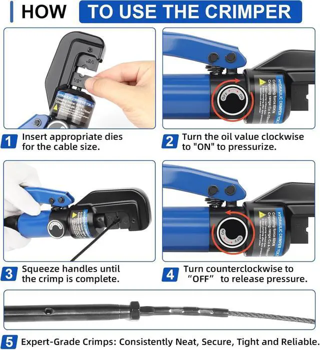Easy to Use The On/Off control offers ease of use, and the oil return valve ensures quick release and leak resistance. The spring-loaded grooves on the dies make crimping secure and tidy, producing strong, clean hexagonal crimps.