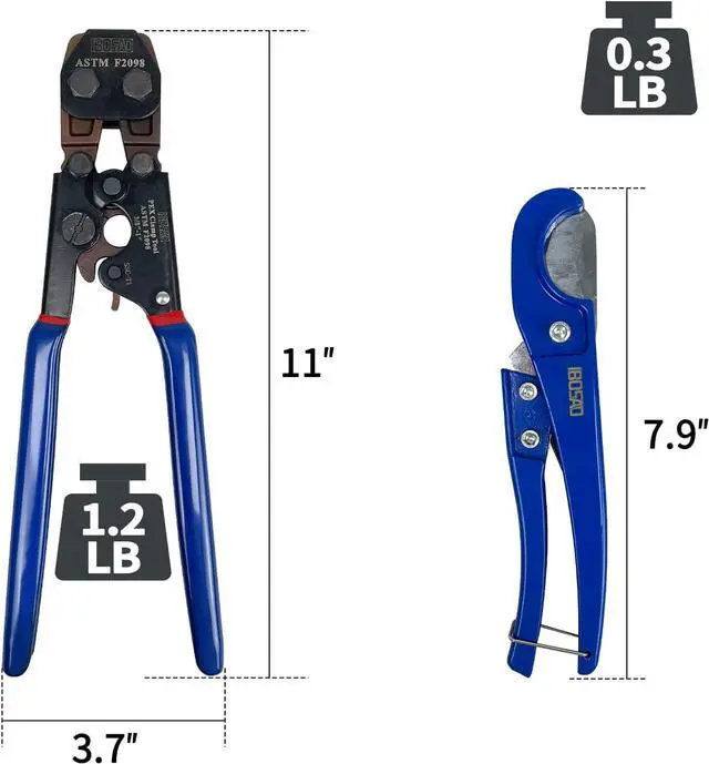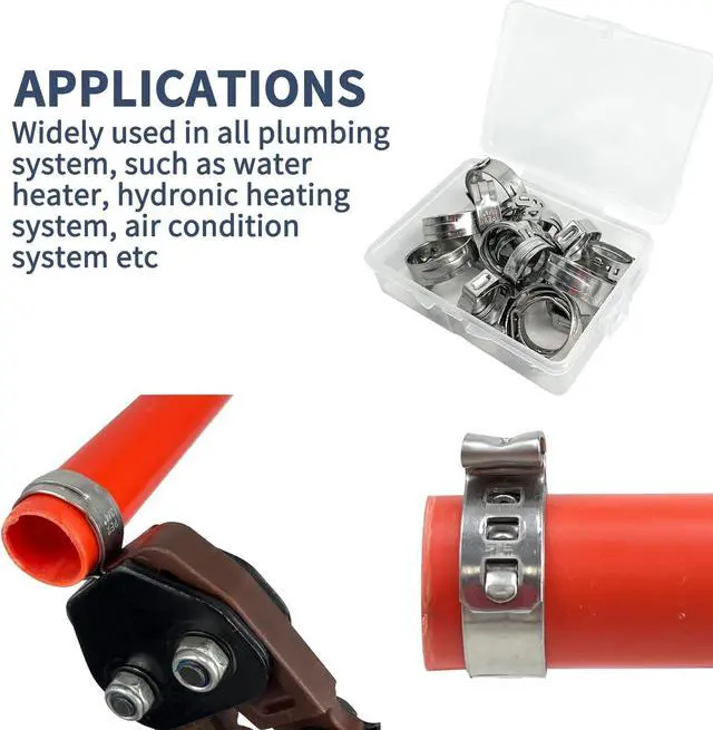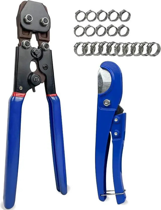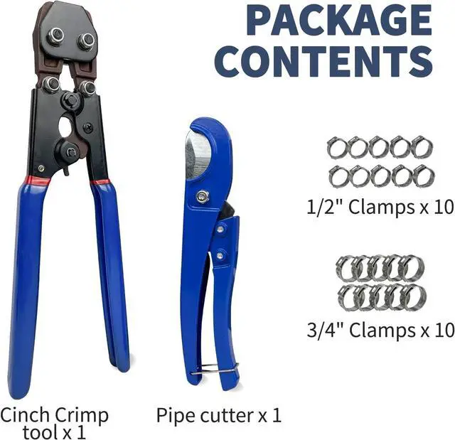 Package includes 1pc of cinch crimp tool, 1pc of pipe cutter, 10pcs of 1/2" clamps and 10pcs of 3/4" clamps.