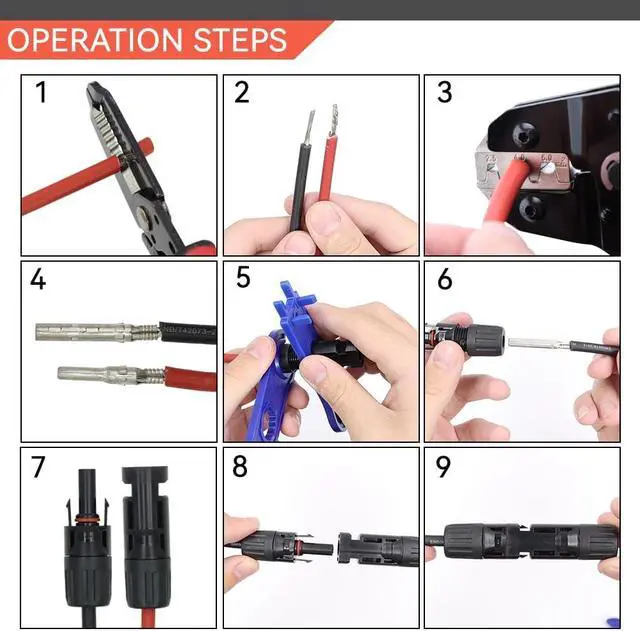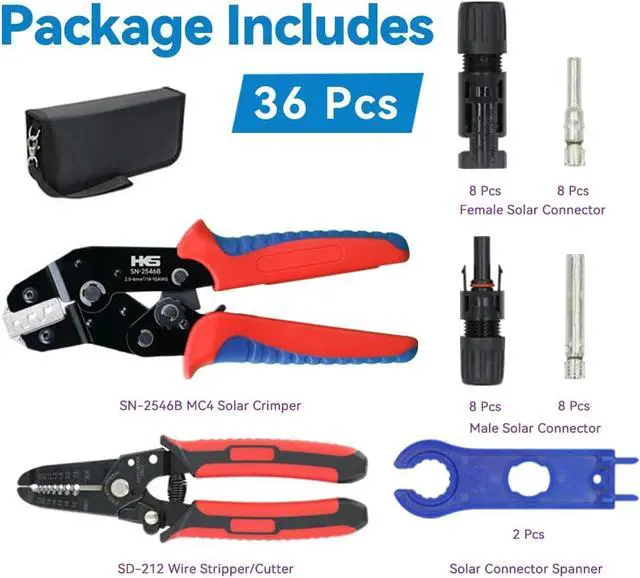Professional Crimper Kit - This crimper features an efficient ratchet mechanism and a precision machined crimp die for a solid crimp. The kit includes 1 * Crimper 2 * Spanner 1 * Stripper and 8 pairs of solar connectors.