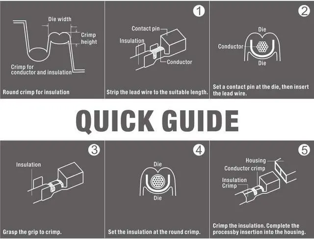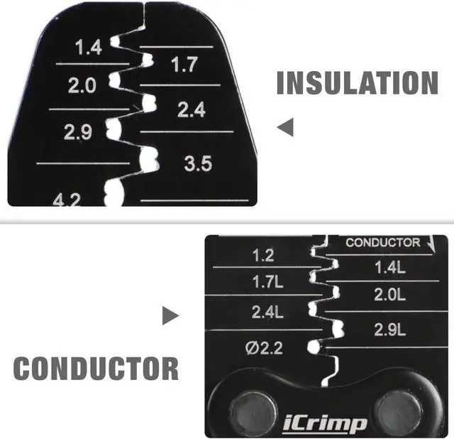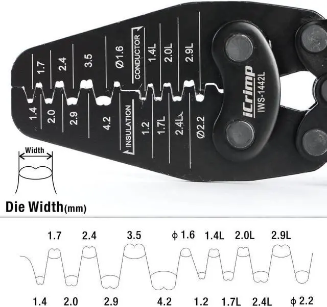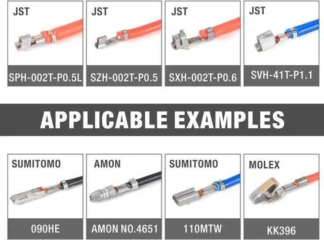 15 various-sized dies for a wide range of open barrel terminal sizes from AWG 30 to 14applicable to JST, Molex, TE, JAR, HRS pins
