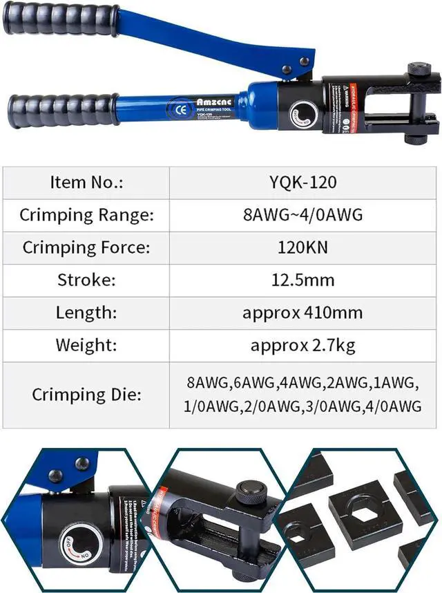 Versatile Die Sets - Our hydraulic crimping tool comes with 9 die sets, including 8AWG, 6AWG, 4AWG, 2AWG, 1AWG, 1/0AWG, 2/0AWG, 3/0AWG, and 4/0AWG. Perfect for a wide range of cable wire terminals.