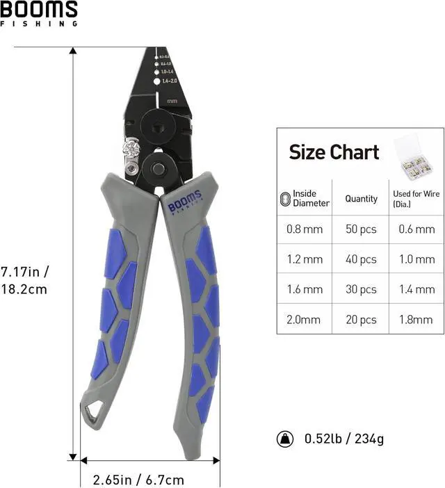 Crimp Sleeve Pliers: Cup to cup type crimping for use with oval sleeves and double barrel sleeves. Total 140pcs crimp sleeves included, 2mm x 20pcs, 1.6 mm x 30pcs, 1.2 mm x 40pcs, 0.8 mm x 50pcs.