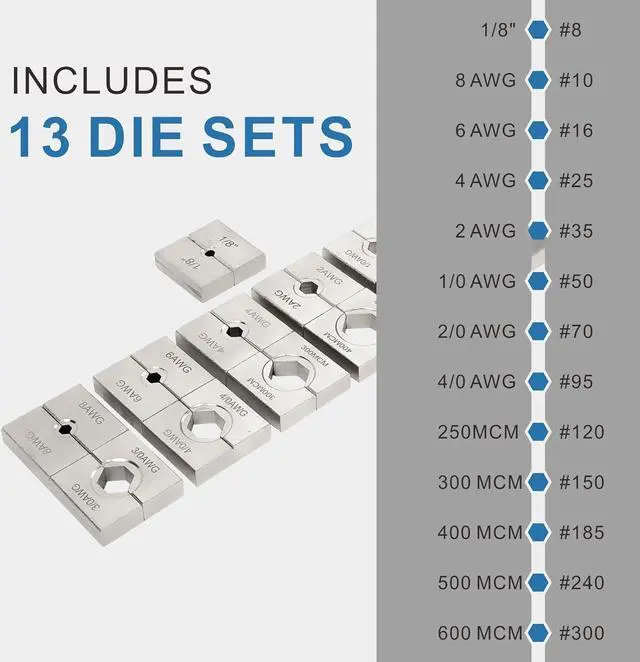Quick crimper This hydraulic crimper provides hexagonal confining pressure with 13 pairs of hexagon crimping dies ( (AWG: 9.8. 6, 4, 2, 1/0, 2/0, 4/0, MCM: 250, 300, 350, 500, 600)