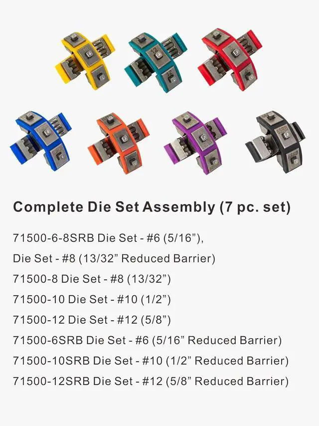 Clear and Detailed Die SizesThe kit includes accurately sized dies for a comprehensive range of hoses: 6-8SRB (5/16 and 13/32 Reduced Barrier), 8 (13/32), 10 (1/2), 12 (5/8), with reduced barrier options 6SRB (5/16 Reduced Barrier), 10SRB (1/2 Reduced Barrier), and 12SRB (5/8 Reduced Barrier), ensuring precise crimps for various applications.