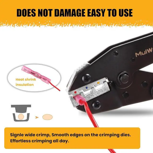 PRECISION TERMINAL CRIMPER SYSTEM: MulWark professional crimping tool features a micro-adjustable star wheel to customize compression force for different gauge wires. The heavy-duty ratcheting crimper mechanism requires 30% less effort while guaranteeing 100% reliable crimps on both heat shrink and standard insulated terminals.