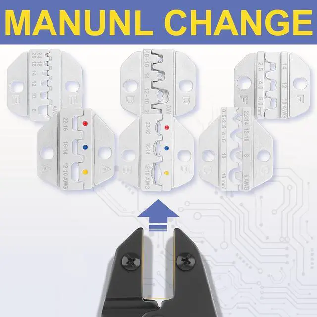 Choose Without Barriers- Your equipment should never hold you back; When you need to change different wire connectors, the AWG-marked chrome-plated crimp dies offer you 6 options including heat shrink connectors, Insulated and nylon wire terminals, Non-insulated terminals, Insulated cable-end sleeves, open barrel terminals and solar connectors. Easy to operate, no confusion!