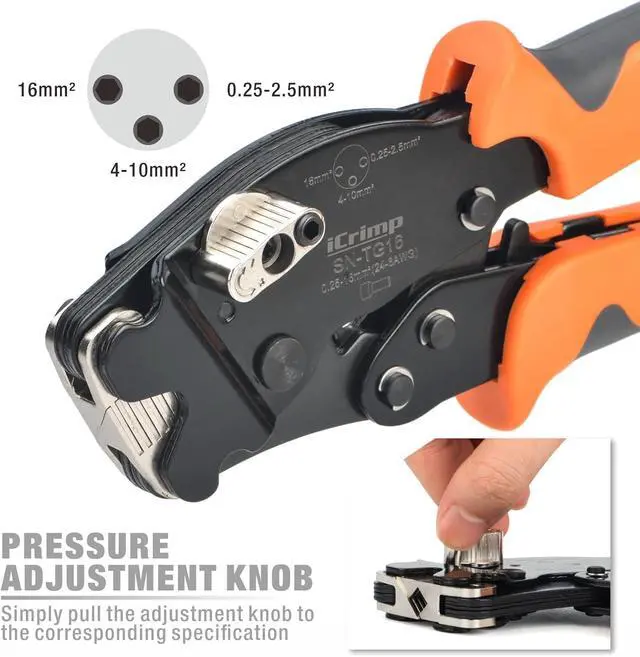 Ratchet crimper with an adjustable knob to adjust itself to the appropriate diameter for crimping terminals covers an extremely wide range of applications, ensures accuracy and reliability for each crimp.