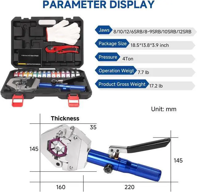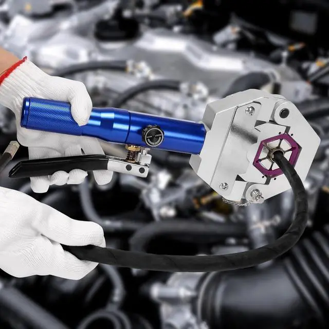 Precision hydraulic A/C hose crimping toolThe tool is designed for handheld hose crimping, ensures portability and easy operation without the need for benchtop mounting, Made of aluminum alloy, it is durable and has better crimping effect