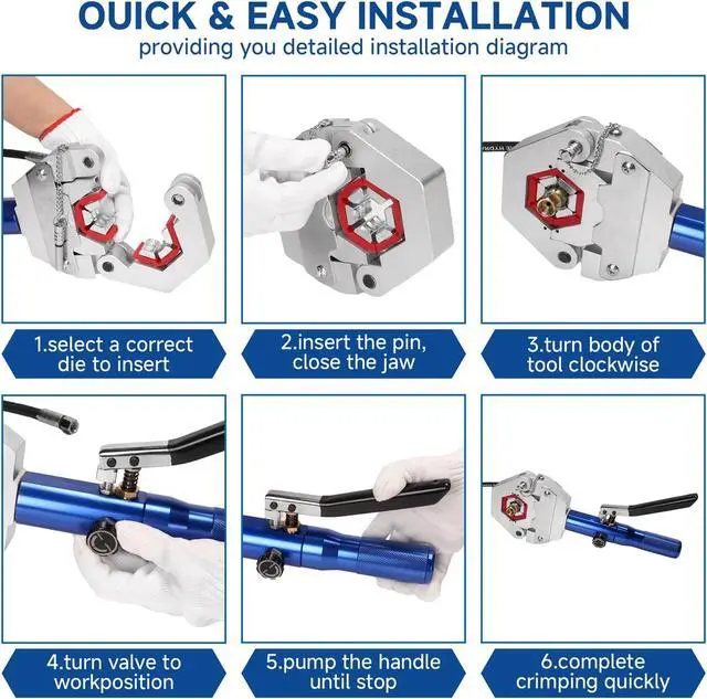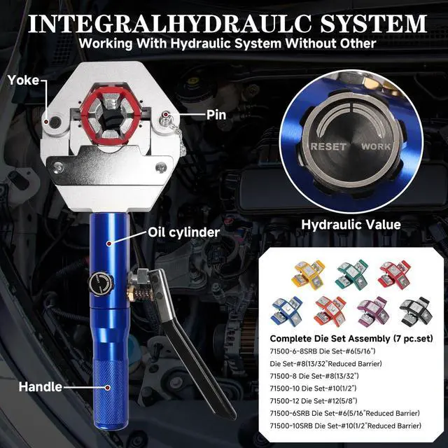 Complete and Detailed Die SizeThis kit includes accurate size dies for various hoses: 6-8SRB (5/16 and 13/32 drag reduction), 8 (13/32), 10 (1/2), 12 (5/8), drag reduction options 6SRB (5/16 drag reduction), 10SRB (1/2 drag reduction) and 12SRB (5/8 drag reduction), ensuring precise crimping in various applications