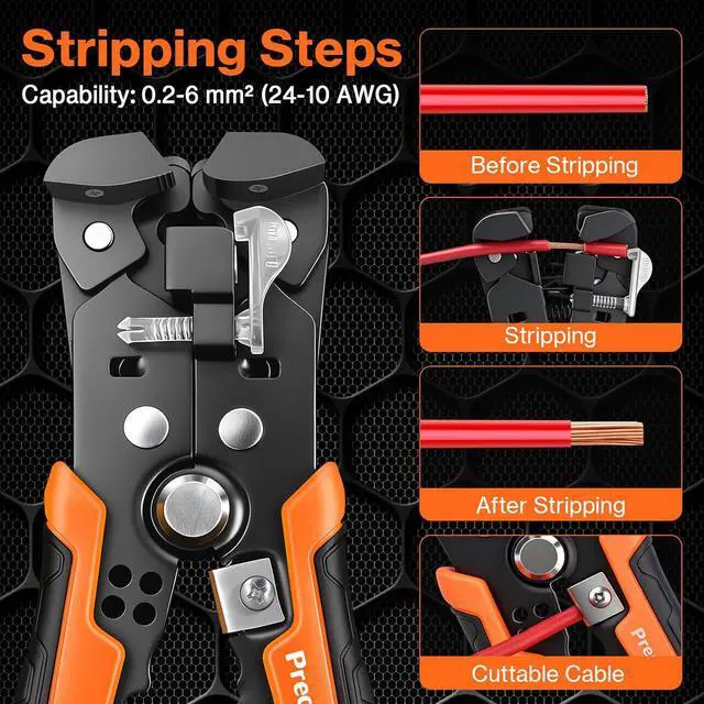 AUTOMATIC WIRE STRIPPER: with AWG24-10 wire stripper, stripping wire is easier, suitable for 0.2 -6mm² single core/multi-core wires, 2-8pin flat wires, 0.75 mm² coaxial wires, etc.