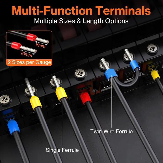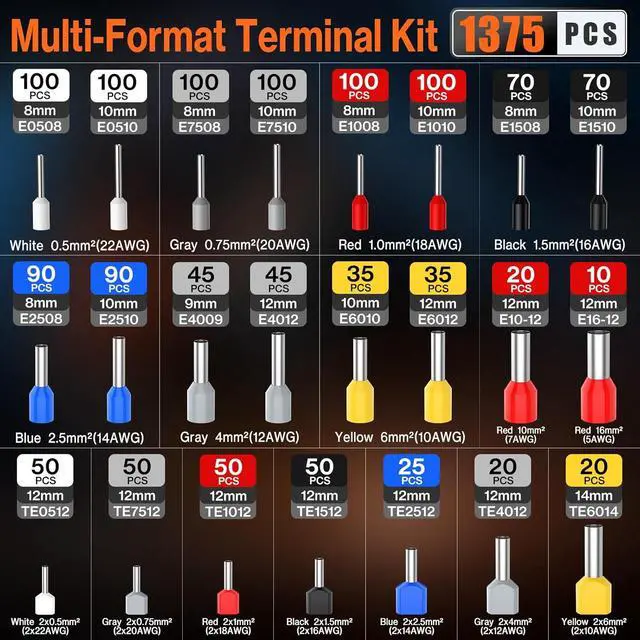 FERRULE CRIMPING TOOL KIT: The ferrule kit includes crimping pliers AWG 28-5 ( 0.08 -16mm²), wire stripper, 1110Pcs Single ferrules connectors, 265Pcs Twin ferrule connectors and a double-layer storage box.