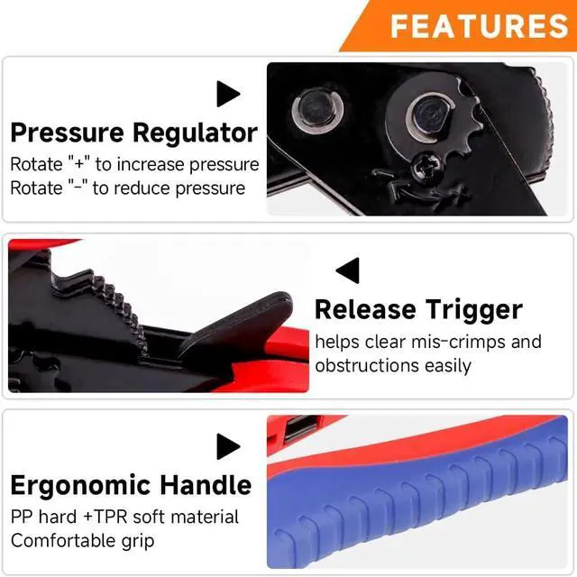 Adjustable Crimp Force: The tool has a knob that adjusts the crimp strength to ensure the right crimp force for your project. Equipped with a quick release lever allows the crimper jaw to be opened in any position.