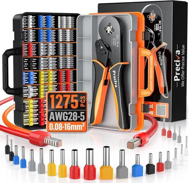 PROFESSIONAL CRIMPING TOOL: The ferrule kit includes crimping pliers AWG 28-5 ( 0.08 -16mm²), 1010Pcs single ferrule connectors (Two lengths), 265Pcs twin ferrule connectors and a double-layer portable storage box for easy carrying and organization.