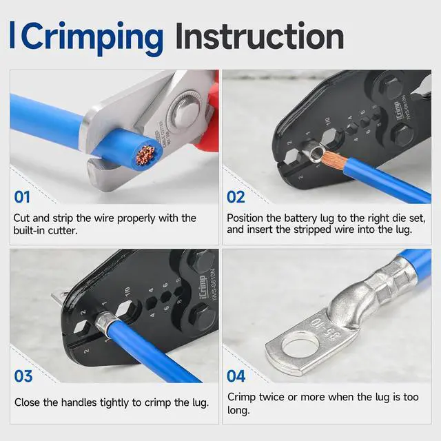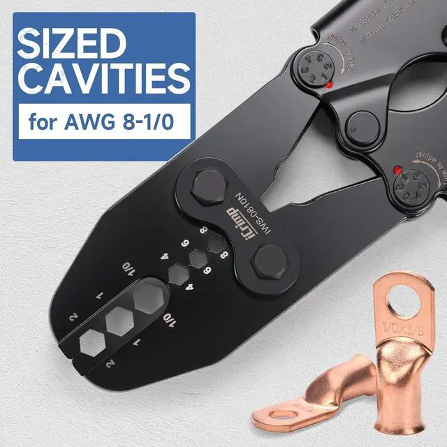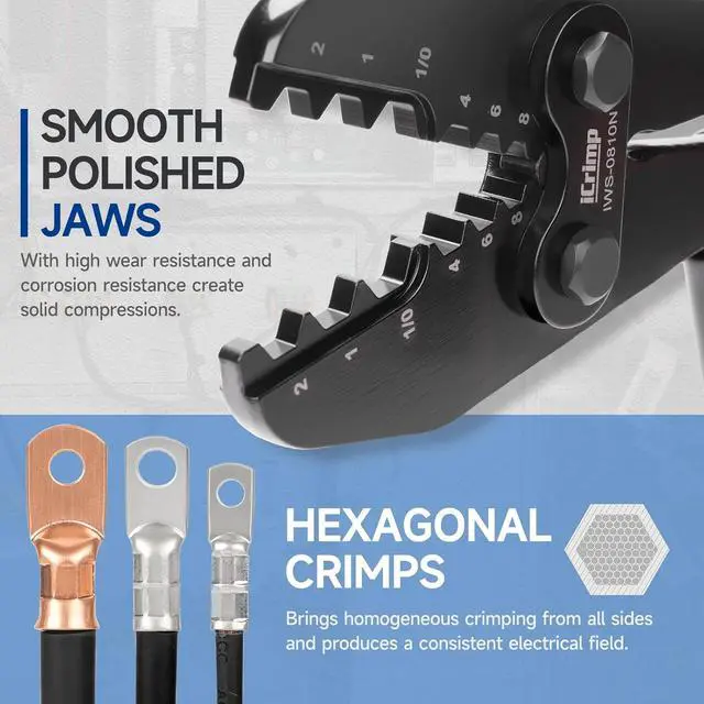 Used to crimp AWG 8, 6, 4, 2, 1, 1/0 copper cable lugs used in emergency vehicles, generator sets (gensets), power distribution recreational vehicles, trucks, cranes and lifting equipment.