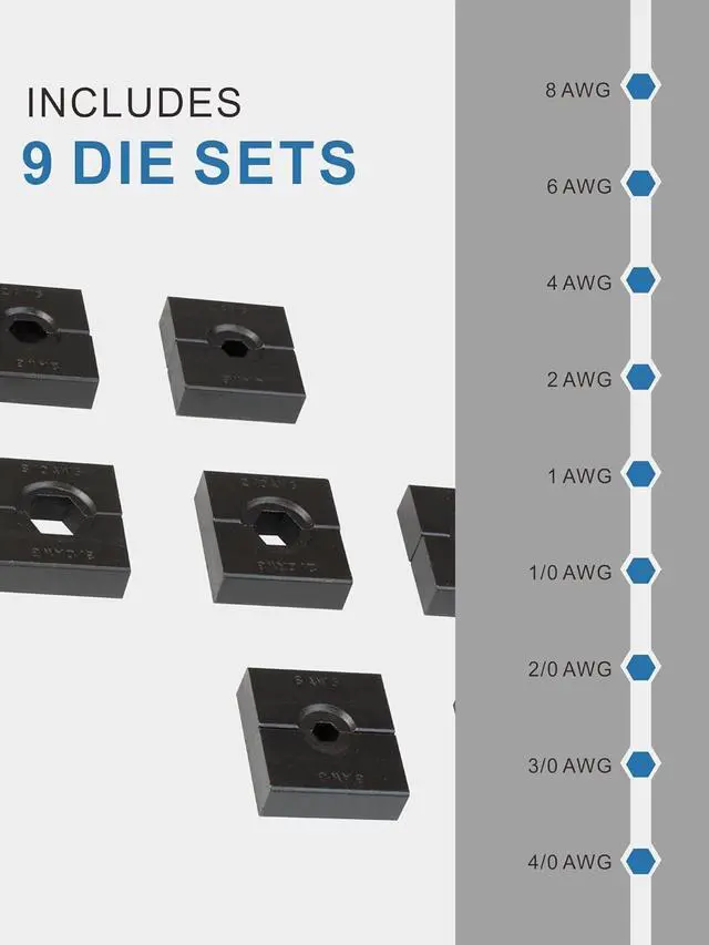Standard American Wire Gauge (AWG) Dies: Our crimping dies are all standard AWG sizes, ensuring that they will fit American-style terminals perfectly. The set includes dies for 8AWG, 6AWG, 4AWG, 2AWG, 1AWG, 1/0AWG, 2/0AWG, 3/0AWG, and 4/0AWG wires, so you can tackle a wide range of crimping jobs.