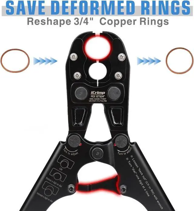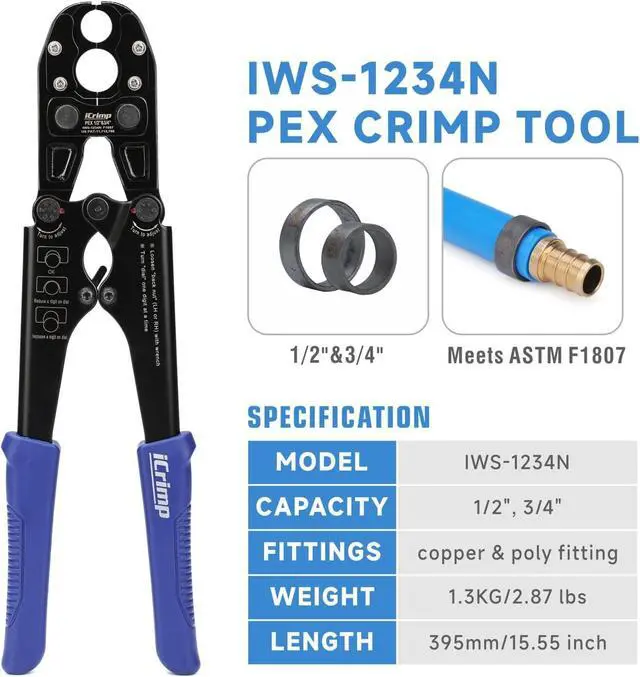 IWS-1234N PEX crimping tool allows you to make a secure connection to PEX with copper crimp rings and PEX barbed fittings in sizes 1/2 in. and 3/4 in.