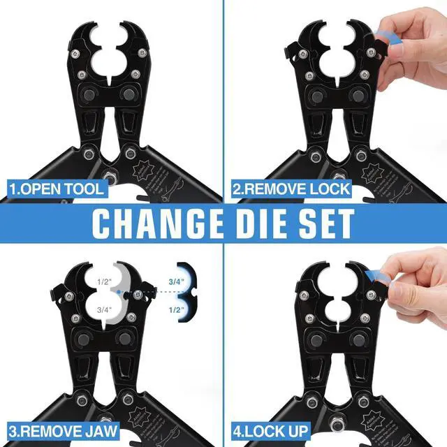Quick change and reversible die set changes position of 1/2 and 3/4 jaws without any tool. Excellent choice whenever space is a challenge. Patented design.