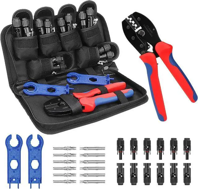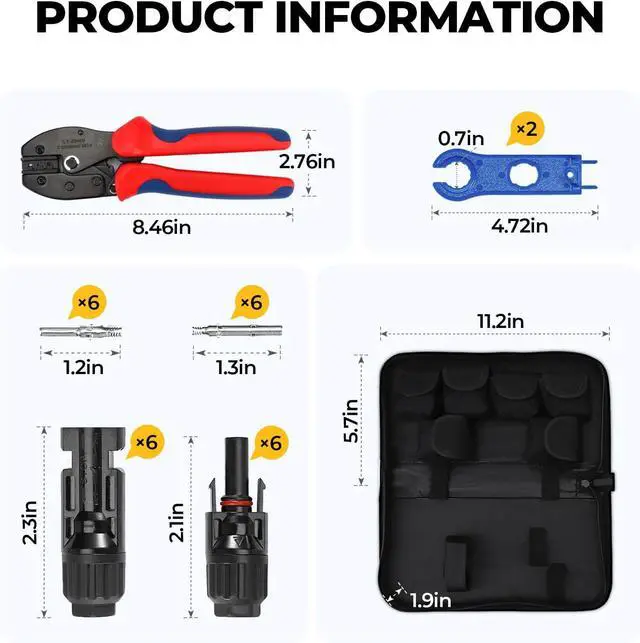 PACKAGE INCLUDED: 1 pair of wire crimper, 6 Pairs solar panel connectors, 1 pair solar connector spanner