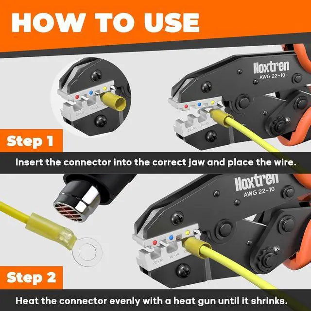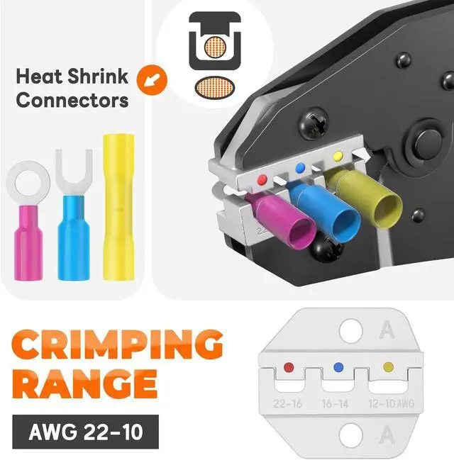 Professional Heat Shrink Crimper: Engineered for heat shrink terminals (AWG 2210), this ratcheting crimping tool works as a precise wire crimping tool and wire crimper for sealed connections. Its reinforced jaws apply even pressure, giving you a dependable crimp tool and versatile terminal crimping tool for automotive, marine, and electrical projects.