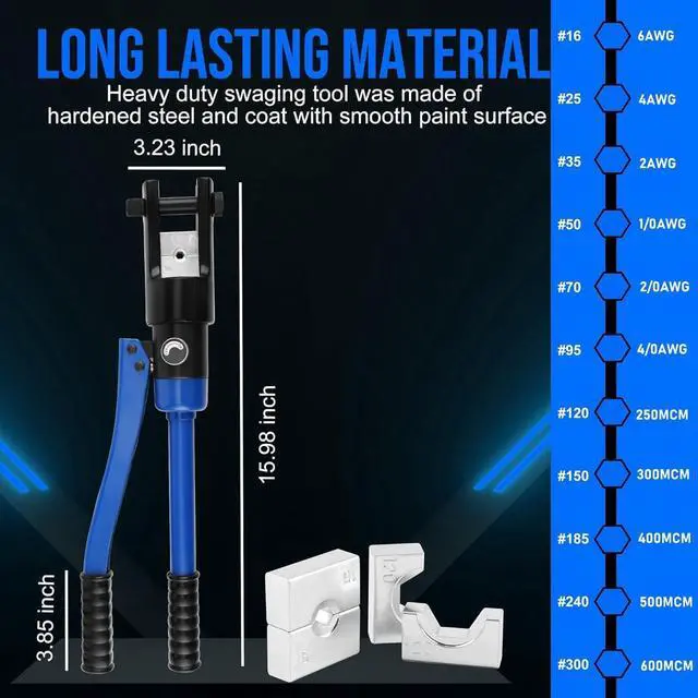 Wide Application: Equipped with 11 sets of crimping dies for AWG sizes 4 to 600MCM, it effectively crimps copper and aluminum wires, ideal for battery, welding, and power cables
