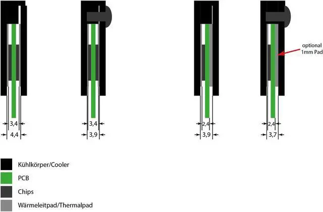 With the new Alphacool D-RAM modules all memory blocks can easily and quickly be equipped with water coolers! With these modules, the memory blocks are clamped in the modules (with the attached thermal pads) to achieve optimum cooling results . The seperately available D-RAM coolers are added and screwed in. We recommend a very thin layer of thermal paste applied between module and cooler for an optimal heat transfer. Note: A thicker thermal pad must be used on one side for single-sided memory blocks which is not included and has to be bought seperately. Includes 2x module for D-RAM, 4x thermal pads, and fitting accessories.