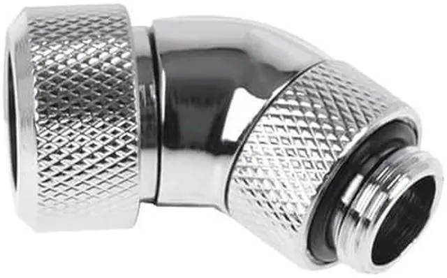 This fitting has a 1/4" thread on one side and is thereby compatible with 95% of components. The other side fits a 13mm acrylic or brass tube. This fitting is bent 90° in the middle to avoid complicated hose connections. The threaded side is rotatable for maximum flexibility.