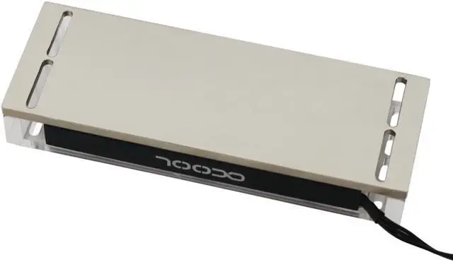 The cooler itself consists of a massive 4 mm thick copper block which has been nickel plated. The design is now identical to all new Aurora products from Alphacool. Since a pure Plexiblock is not very pretty, we have embedded a nice black frame. This makes the cooler more interesting and fits harmonically very well into the Aurora series.