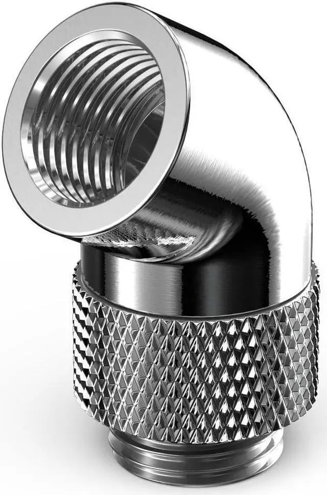 The PrimoChill Male to Female G 1/4in. 60 Degree SX Rotary Elbow Fitting is an easy solution when trying to change direction quickly with your loop. This adapter is great for redirecting tubing runs away from components at unconventional angles. The rotary function allows you to aim the connection in any desired direction 60 degrees from the mount.