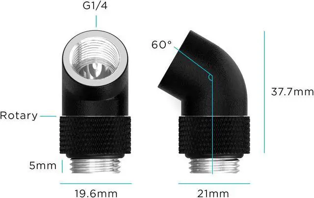 The PrimoChill Male to Female G 1/4in. 60 Degree SX Rotary Elbow Fitting is an easy solution when trying to change direction quickly with your loop. This adapter is great for redirecting tubing runs away from components at unconventional angles. The rotary function allows you to aim the connection in any desired direction 60 degrees from the mount.