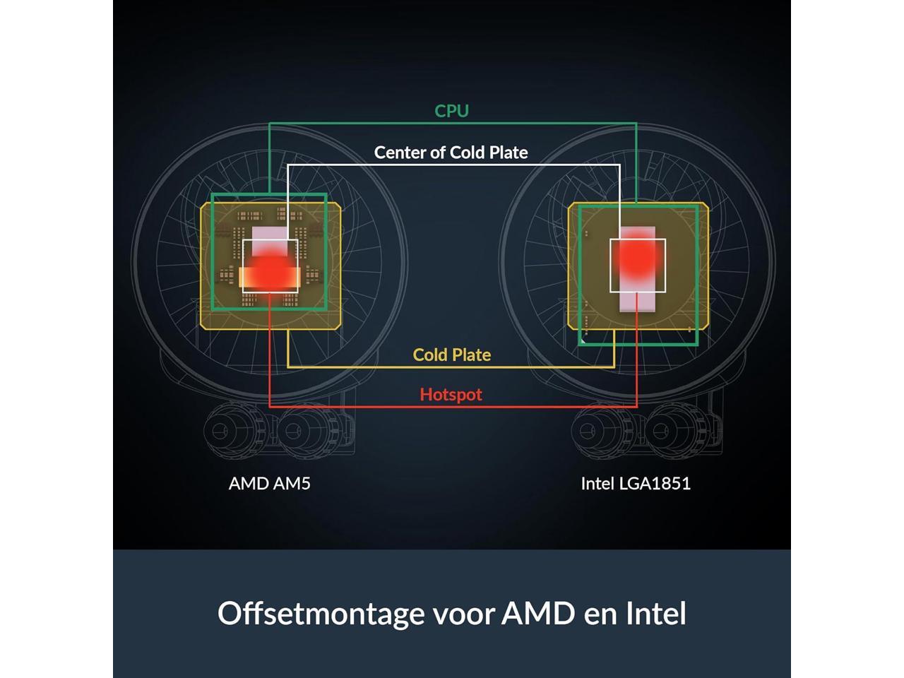 - NATIVE OFFSET MOUNTING FOR INTEL AND AMD: Shifting the cold plate center towards the CPU hotspot ensures more efficient heat transfer