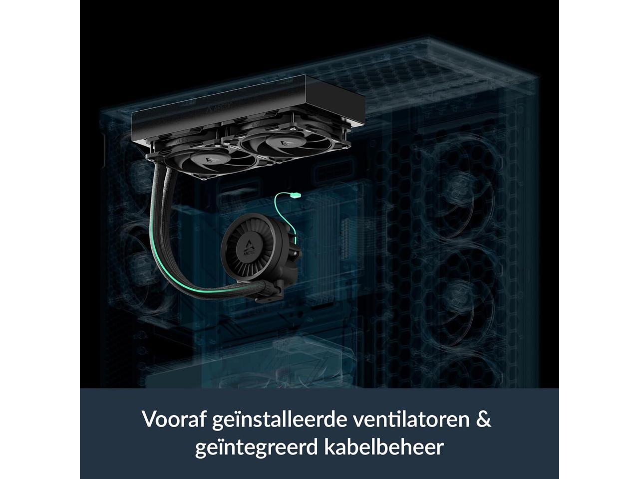 - INTEGRATED CABLE MANAGEMENT: The PWM cables of the radiator fans are integrated in the sheathing of the hoses so that only a single visible cable is connected to the motherboard