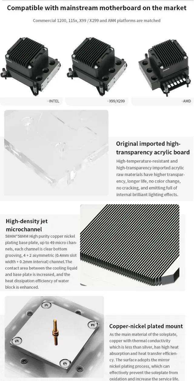 Compatible With LGA115x/1200/1700 & X99/X299 platform. Performance version with no lighting. High heat resistance POM material, with 17w PWM pump. High purity copper nickel plated base plate. CPU block & pump AIO combo.