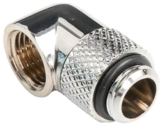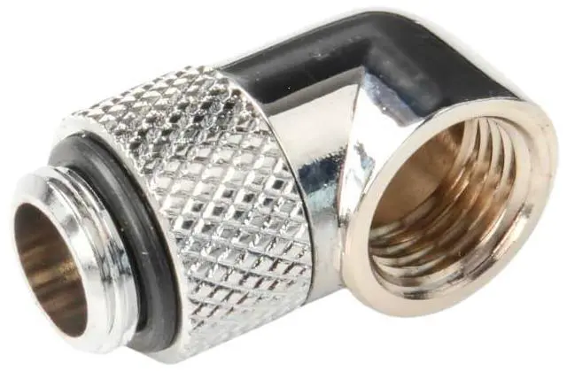 Crafted from nickel-plated brass for exceptional durability and reliability, this 90° rotary fitting adapter connector is designed for computer water cooling systems requiring precision G1/4" threads. It enables smooth, secure connections for fittings with G1/4" threads, making it ideal for creating or extending tubing pathways in custom liquid cooling setups. Featuring G1/4" BSP threads with a 5mm male thread length and 6mm female thread length, it offers excellent compatibility and a precise fit. The knurled section measures 17.9mm in outer diameter, with an installed height of 28.9mm, and includes a high-quality O-ring seal for reliable, leak-free performance.
