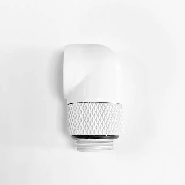 Crafted from nickel-plated brass for exceptional durability and reliability, this 90° rotary fitting adapter connector is designed for computer water cooling systems requiring precision G1/4" threads. It enables smooth, secure connections for fittings with G1/4" threads, making it ideal for creating or extending tubing pathways in custom liquid cooling setups. Featuring G1/4" BSP threads with a 5mm male thread length and 6mm female thread length, it offers excellent compatibility and a precise fit. The knurled section measures 17.9mm in outer diameter, with an installed height of 28.9mm, and includes a high-quality O-ring seal for reliable, leak-free performance.