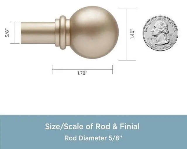 The Kenney® Chelsea 5/8" Standard Decorative Window Curtain Rod features ball finial ends5/8" diameter curtain rod adjusts from 48-86" to fit your window and projects 3" from the wallFor use with light to medium weight curtains in your kitchen, bedroom, dining room, and living roomSteel rod in soft brass finish with decorative ball finial ends and matching mounting hardwareIncludes: one telescoping curtain rod with finials, two brackets, one center support, screws, drywall anchors, and installation instructions