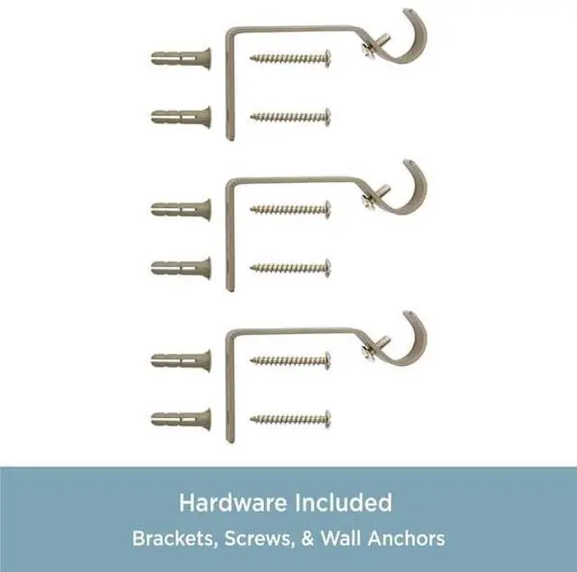 Drapery Hardware Set Includes: one telescoping steel curtain rod with decorative ball finials (1.78" L x 1.48" W x 1.48" H), two mounting brackets, one center support, screws, drywall anchors, and installation instructions.