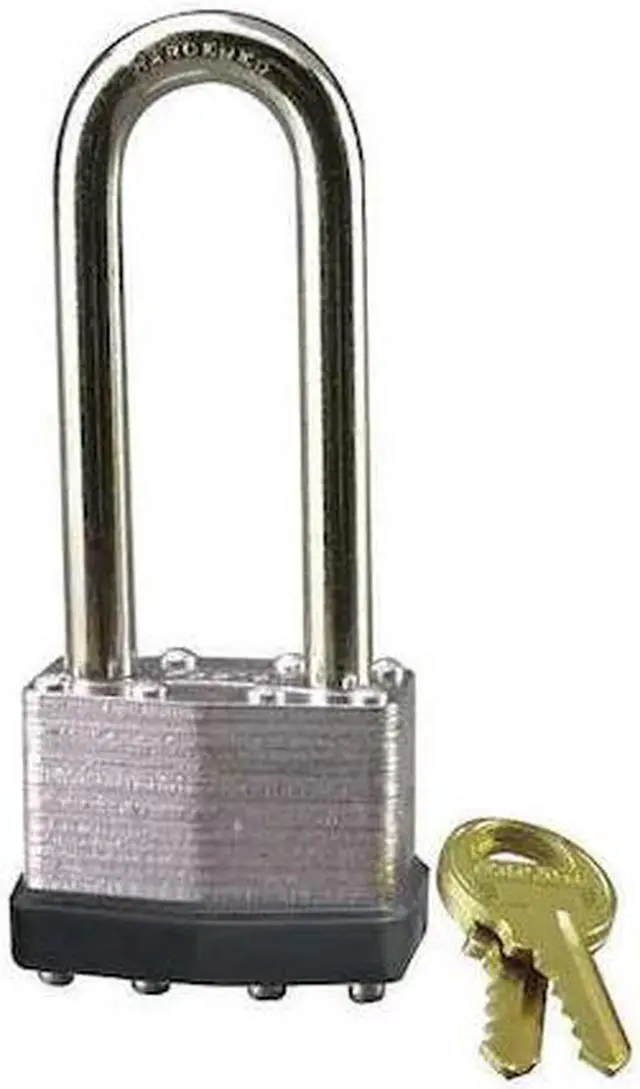 Padlock, Shackle Dia. 1/4 in, Shackle Height 2 1/2 in, Shackle Width 27/32 in, Shackle Material Steel, Body Height 1 11/32 in, Body Width 1 3/4 in, Body Thickness 7/8 in, Body Material Steel, Number of Bumpers 1, Number of Pins 4 Pin, Key Type Alike, Control Key Registration Required No, Opens with Key No. GM1510, Body Color Silver, Body Finish Laminated, Weather Resistant No, High Security No, Interchangeable Core No, Padlock Body Shape Rectangular, Rekeyable No, Shackle Type Long Shackle