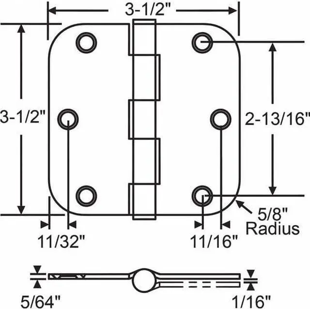 Butt Hinge, Steel, Satin Brass Finish, 100 lb Load Capacity, With Holes, 3 Holes per Leaf, No Ligature Resistant, 160 Degrees Range of Motion, Orientation Non Handed, 3 1/2 in Door Leaf Height, 3 1/2 in Frame Leaf Height, 1 1/2 in Door Leaf Width, 1 1/2 in Frame Leaf Width, 0.088 in Door Leaf Thickness, 0.087 in Frame Leaf Thickness, 1-3/8 in Required Door Thickness, Plain Bearing Bearing Type, Rounded Corners, Included Hardware, 1 Pair