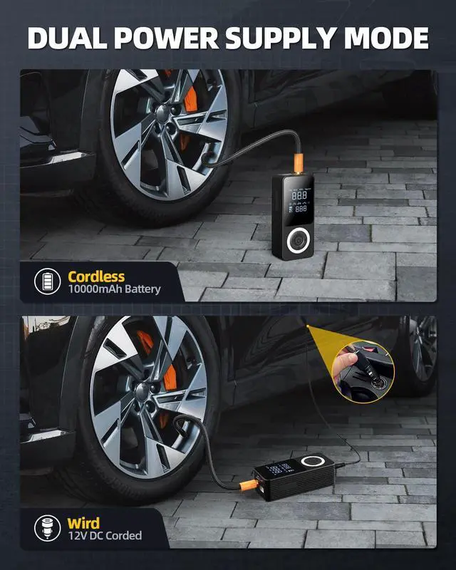 Cordless Tire Inflator Portable Air Compressor, 150 PSI Air Pump with Rechargeable Battery, Tire Pressure Gauge, 12V Car Power Adapter, Smart Air Pump for Car, Motorcycle, Bike, Ball