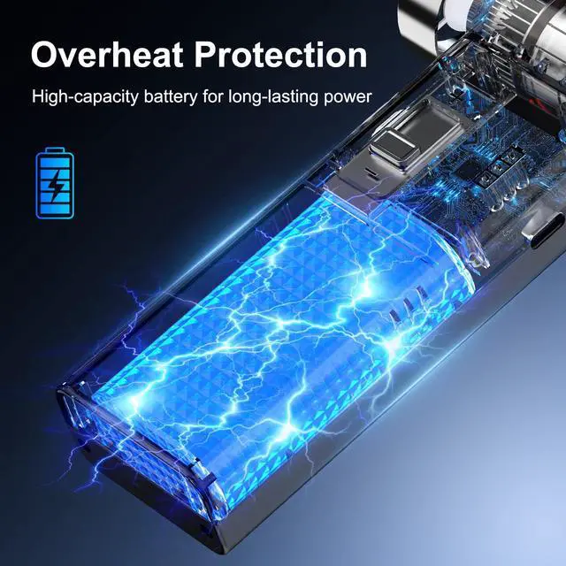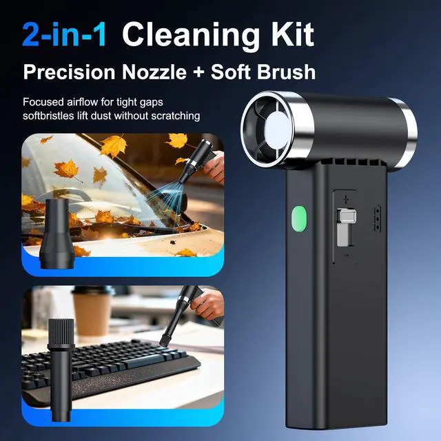 PowCube runs up to 2 hours on lower airflow settings. Higher airflow draws more power and is best for short bursts on stubborn dust. For the longest runtime, use the stepless slider to match the job.