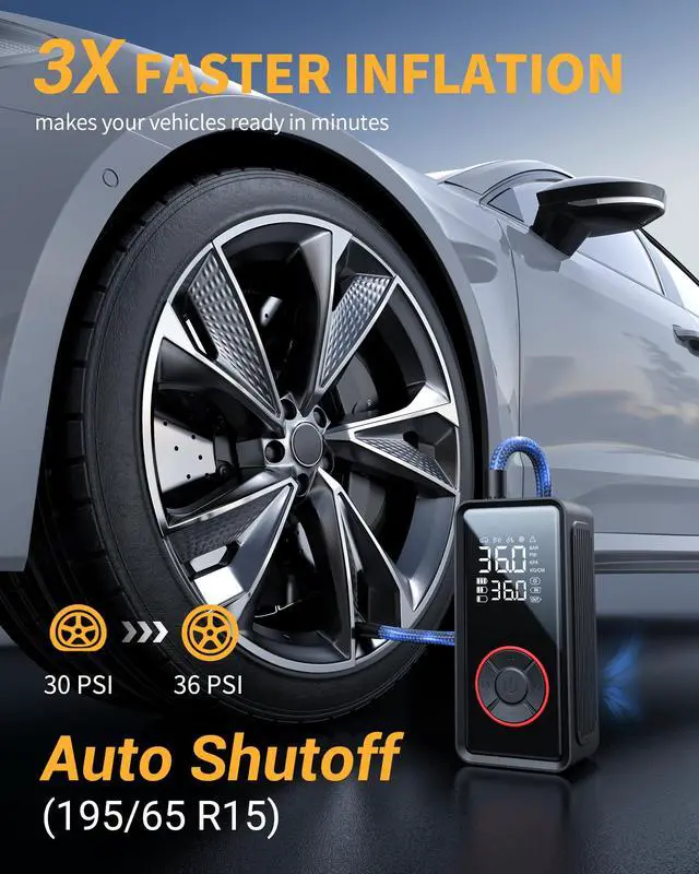 2. Powered by a high-efficiency motor, it delivers up to 3X faster inflation, filling a 195/65 R15 tire from 30 to 36 PSI in minutes. The large rechargeable battery supports multiple inflations per charge.